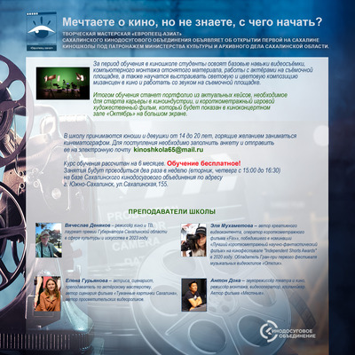 Творческая мастерская «Европеец-азиат» Сахалинского кинодосугового объединения объявляет об открытии первой на Сахалине киношколы под патронажем регионального министерства культуры и архивного дела.