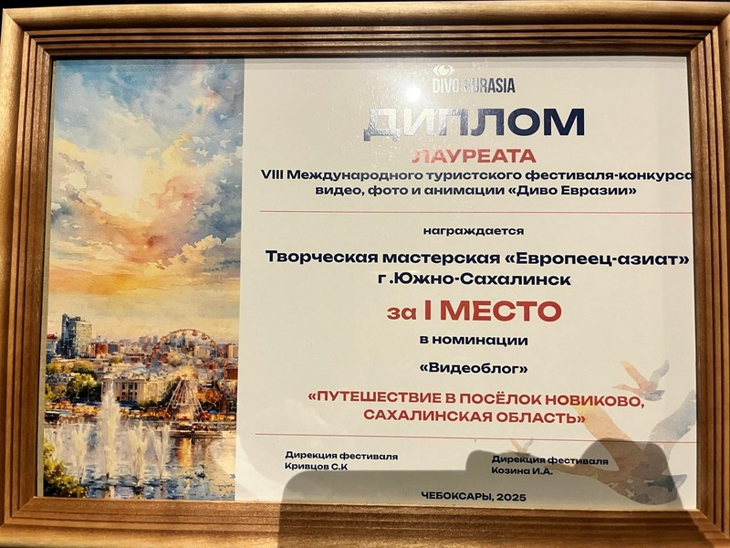 Работа творческой мастерской «Европеец-Азиат» Сахалинского кинодосугового объединения «Путешествие в посёлок Новиково» стала победителем VIII Международного туристического кинофестиваля «Диво Евразии» в категории «Видеоблог».