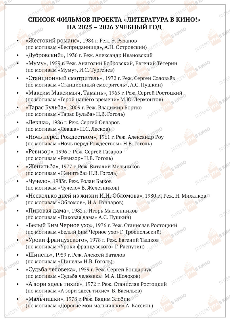 Школьная программа по литературе 5-11 классов на экране кинотеатра! Социальный культурно-просветительский проект «ЛитератУра в кино!» приглашает юных зрителей.
