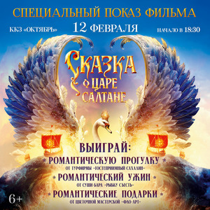 12 февраля в ККЗ «Октябрь» состоится премьерный показ красочного фэнтези «СКАЗКА О ЦАРЕ САЛТАНЕ», начало в 18:30.